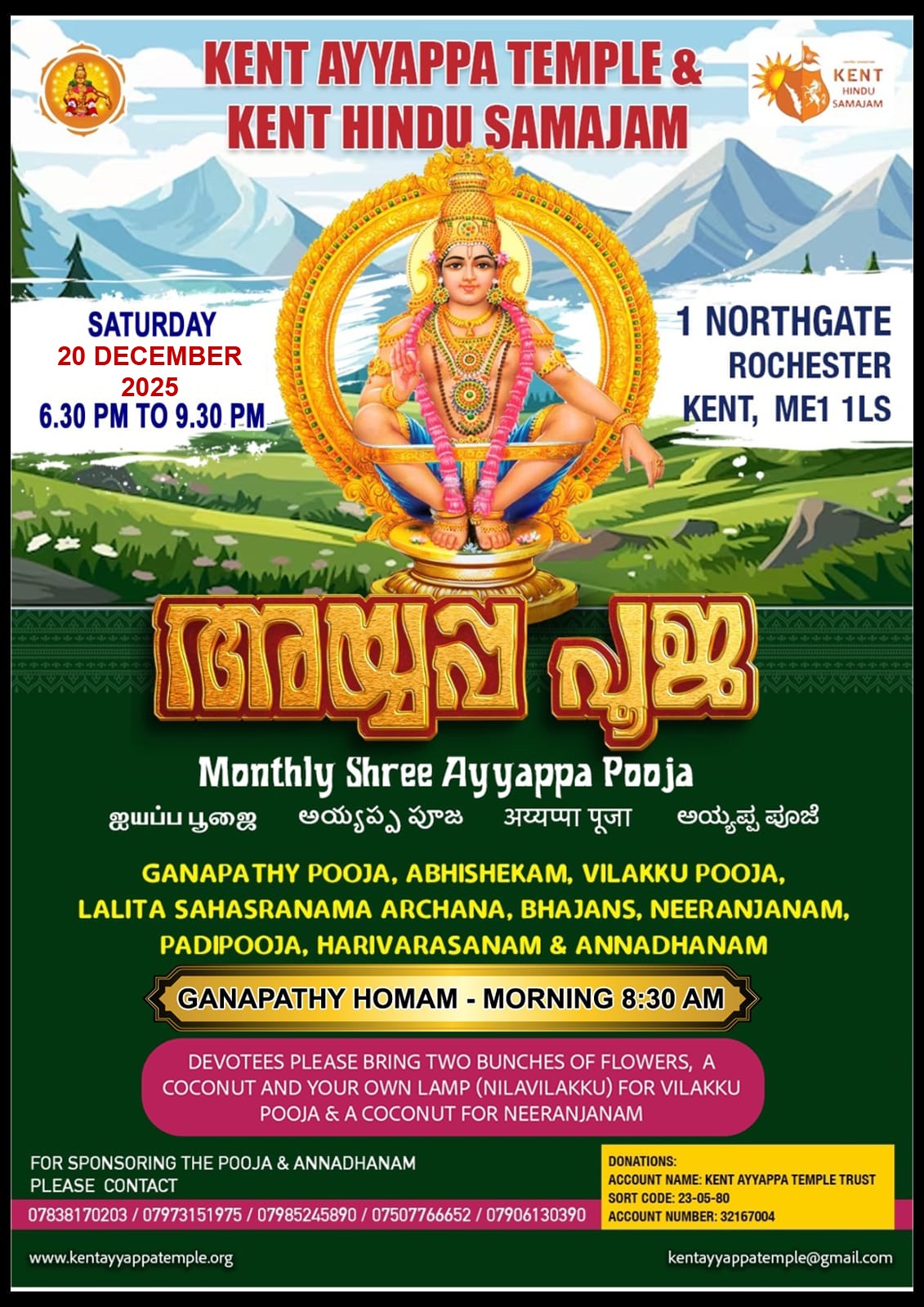 If any devotees would like to sponsor poojas or Annadhanam, please contact us via email (kentayyappatemple@gmail.com) or call 07838170203 / 07985245890.