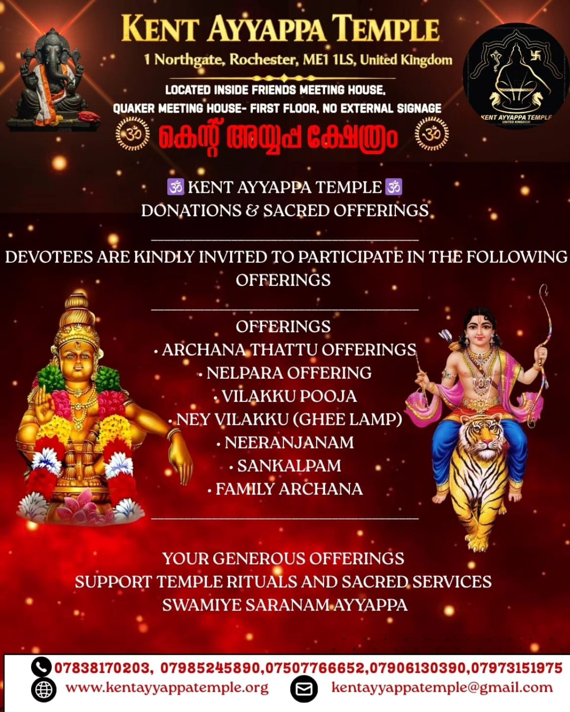 If any devotees would like to sponsor poojas or Annadhanam, please contact us via email (kentayyappatemple@gmail.com) or call 07838170203 / 07985245890.