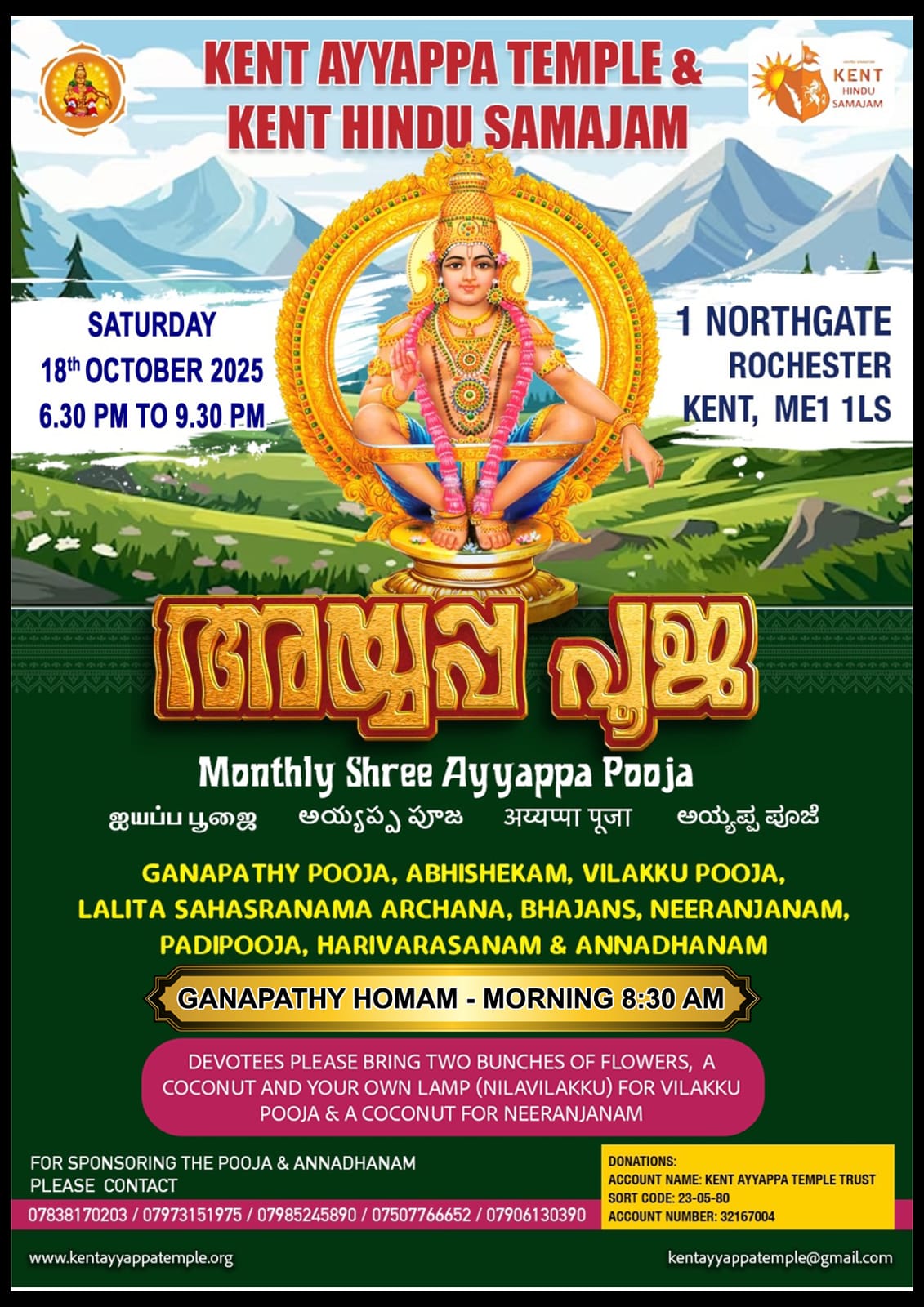 If any devotees would like to sponsor poojas or Annadhanam, please contact us via email (kentayyappatemple@gmail.com) or call 07838170203 / 07985245890.